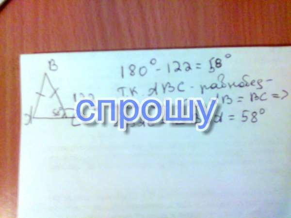 В равнобедренном треугольнике abc (АС-основание) внешний угол треугольника при вершине с равен 122 градуса. найдите угол bac.