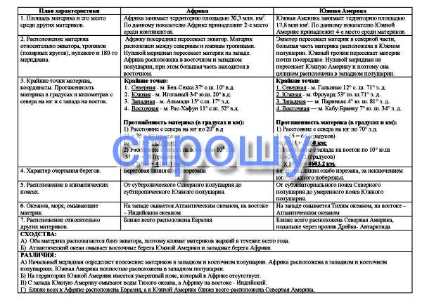 Выполните практическую работу. Сравните географическое положение Южной Америки и Африки, определите черты сходства и различий. Сделайте вывод по итогам сравнения