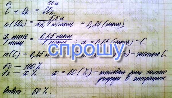 СРОЧНО!!! При сжигании 5 г антрацита выделилось 5,6 л (н.у) углекислого газа. Чему равна массовая доля углерода в антраците (%)?