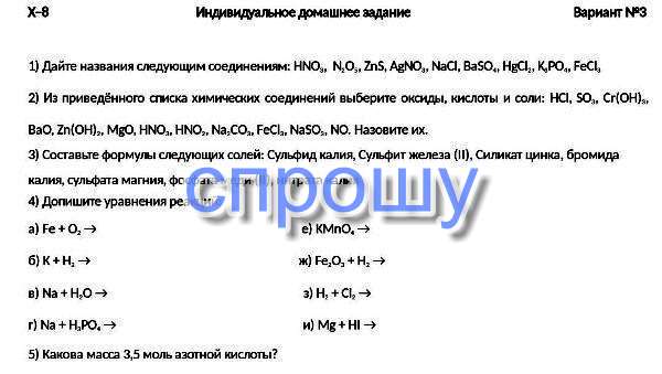 1)азотная кислота, оксид азота 5, сульфид цинка, нитрат серебра, хлорид натрия или поваренная соль, сульфат бария, хлорид ртути, ортофосфат калия, хлорид железа 3