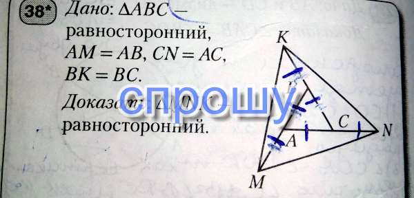 Треугольник ABC - равносторонний;AB = AM; CN = AC;BK = BC. Доказать что треугольник MNK - равносторонний.