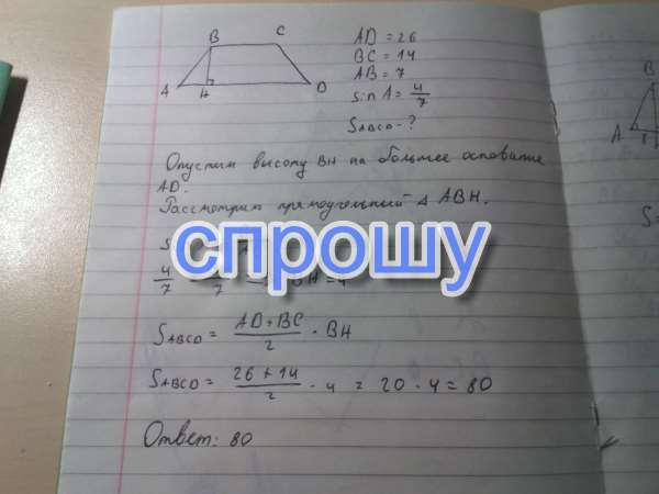 Основания трапеции равны 26 и 14, одна из боковых сторон равна 7, а синус угла между ней и одним из оснований равен 4/7. Найдите площадь трапеции.