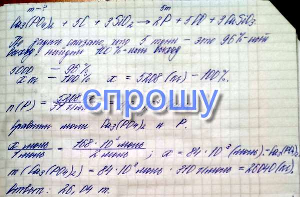 Вычислите массу фосфориту необходимого для производства 5 т фосфора, если выход продукта составляет 96%
