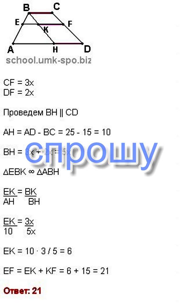 Помогите!!! Прямая ,паралелльная основаниям трапеции ABCD пересекает ее боковые стороны ab и cd в точках E и F соответственно найдите длину отрезка ef если AD = 25 bc 15 СF/DF = 3/2
