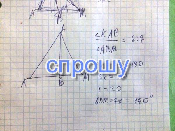 Углы KAB и KBA равны. точка B- середина отрезка KM. градусные меры углов KAB и ABM относятся как 2:7. найдите градусную меру угла ABM