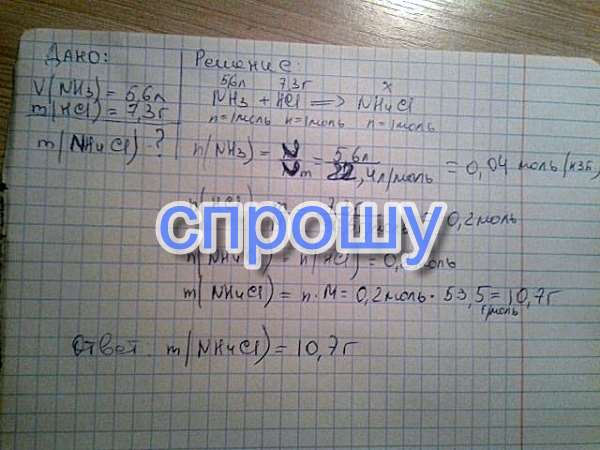 Вычислите массу соли, образовавшейся в результате взаимодействия 7,3 г хлороводорода с 5,6 л аммиака