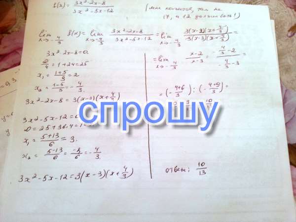Найдите значение предела функции f(x) = 3x2-2x-8/3x2-5x-17 предел до -4/3