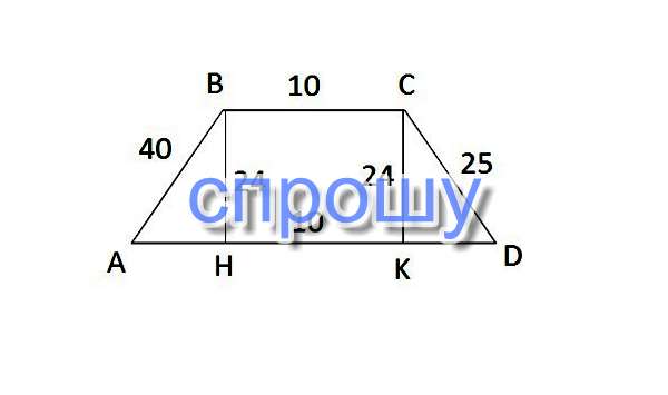 Вычислите периметр трапеции, боковые стороны которой 40 и 25, высота 24 одно из оснований ровно 10, а углы при другом основании острые