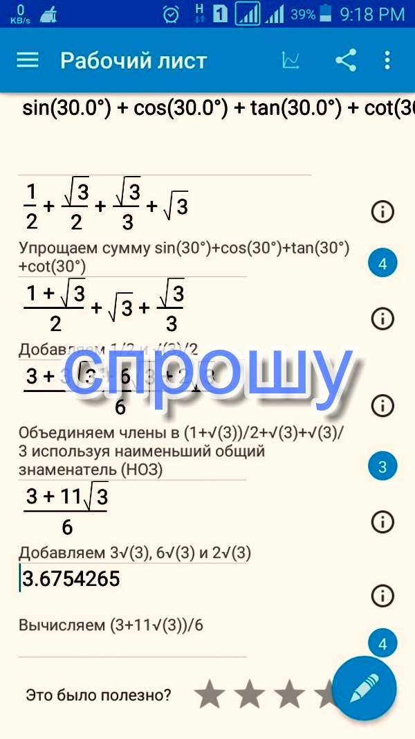 Найдите значение выражения sin a + cos a + tg a + ctg a , если a = 30 градусов