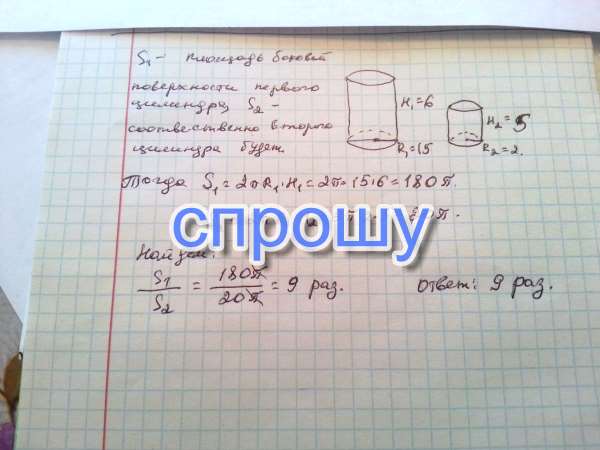 Даны два цилиндра. Радиус основания и высота первого равны соответственно 15и 6, а второго 2 и 5. Во сколько раз площадь боковой поверхности первого цилиндра больше площади боковой поверхности второго?