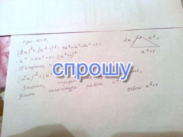 Докажите, что если a>1 то треугольник со сторонами a^2+1, a^2-1 и 2a прямоугольный. Определите длину гипотенузы этого треугольника