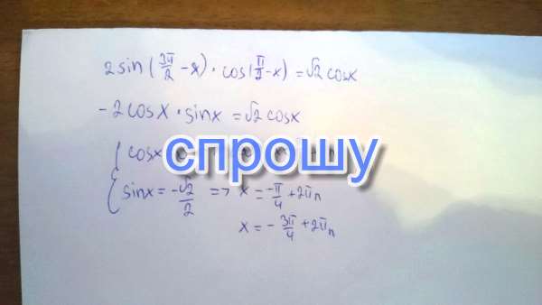 Помогитеееее 2sin((3п/2)-x)*cos((п/2)-x) = sqrt(2)*cosx
