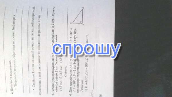 Гипотенуза прямоугольного треугольника равна 7 сантиметров один из катетов равен 2. Укажите другой катет: а) 5 сантиметров, б) 3,5 сантиметра в) 3 под корнем 5см.
