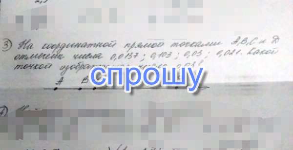 На координатной прямой точками A,B,C и D отмечены числа 0,0137; 0,103, 0,03; 0,021. Какой точкой изображается число 0,03? .