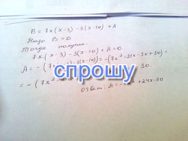 Подберите такой многочлен A,чтобы выражение B было равно нулевому многочлену если B = 7x(x-3)-3(x-10)+a