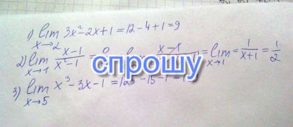 Найдите предел функции а)f(x) = 3x^2-2x+1 , x->2 б)f(x) = (x-1)/(x^2-1) , x->1 в)f(x) = x^3-3x-1 , x->5