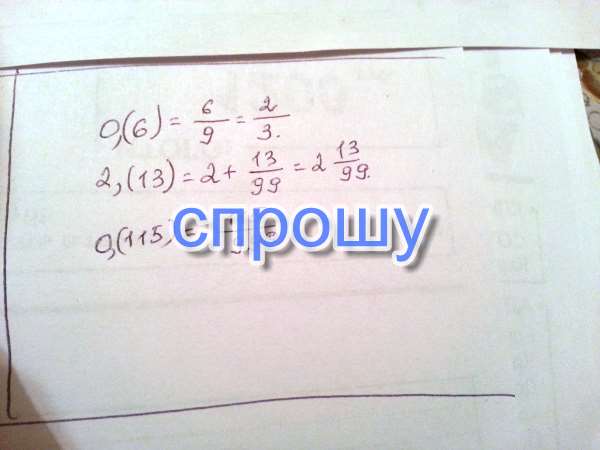 А) 0,(6); б) 2,(13) в) 0,(115) -выразите бесконечные периодические десятичные дроби через обыкновенные дроби