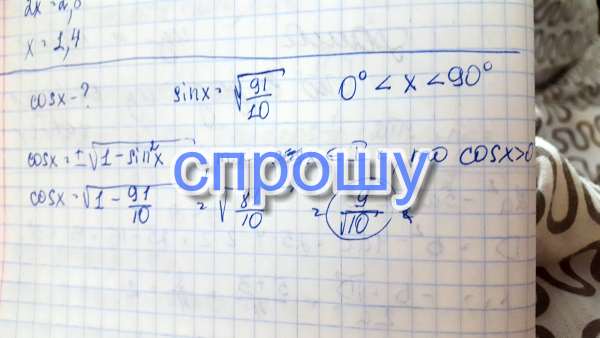Найдите cosx,если sin x = корень из 91/10 и 0 градусов < x < 90 градусов.