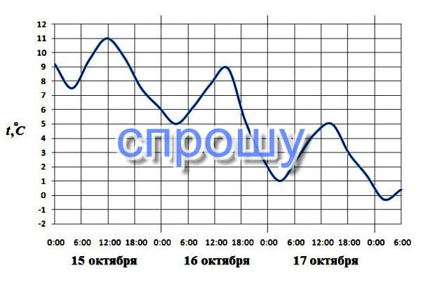 На рисунке показано изменение температуры воздуха на протяжении трех суток. По горизонтали указывается дата и время, по вертикали — значение температуры в градусах Цельсия. Определите по рисунку наименьшую температуру воздуха 16 октября. Ответ дайте в градусах Цельсия.