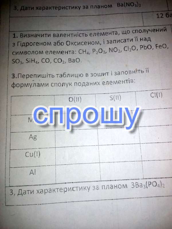 1. CH4 (валентність С 4), P2O3 (валентність P 3), N2O (валентність N 4), Cl2O (валентність Сl 1), PbO (валентність Pb 2), FeO (валентність Fe 2), SO3 (валентність S 6), SiH4 (валентність Si 4), CO (валентність С 2), CO2 (валентність С 4), BaO (валентність Ba 2) Валентність пишеться над хімічним елементом римськими цифрами