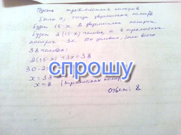 Группа школьников из 38 человек рассели в двухместных и трехместных номерах. всего было занято пятьнадцать номеров. сколько было занято трехместных номеров