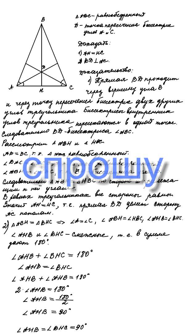 Треугольник АВС- равнобедренный, АС-основание треугольника, D- точка пересечения биссектрис углов А и С. Дакажите, что 1) прямая ВD делит сторону АС пополам 2) прямая ВD перпендекулярна АС, пожалуйста помогите!!