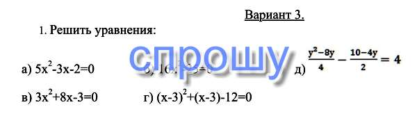 Б)16х²-25=0 (4х)²-5²=0 (4х-5)(4х+5)=0 4х-5=0 4х=5 х=1,25 или 4х=5=0 4х=-5 х=-1,25 Ответ:+-1,25 Г)(х-3)²-(х-3)-12=0 Пусть х-3=t,тогда t²+t-12=0 по теореме Виета:t1=-4 х-3=-4 х=-4+3 х1=-1 или t2=3 х-3=3 х=3+3 х=6 Ответ:-1;6 Д) (у²-8у)/4-(10-4e)/2=4 у²-8у-2(10-4у)=16 у²-8у-20+8у-16=0 у²-36=0 у²-6²=0 (у-6)(у+6)=0 у-6=0 у1=6 или у+6=0 у=-6 Ответ:=-6