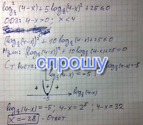 Необходимо решить неравенство: log^2[1/2](4-x)+5log[1/2](x-4)^2+25≤0.