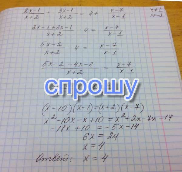 2x-1/x+2+3x-1/x+2 = 4+x-7/x-1 Пожалуйста помогите решить