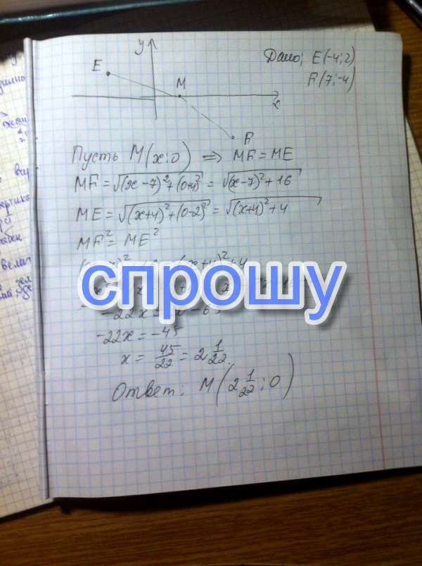 Найдите на оси абсцисс точку одинаково удаленную от точек E(-4, 2) и F(7, -4).