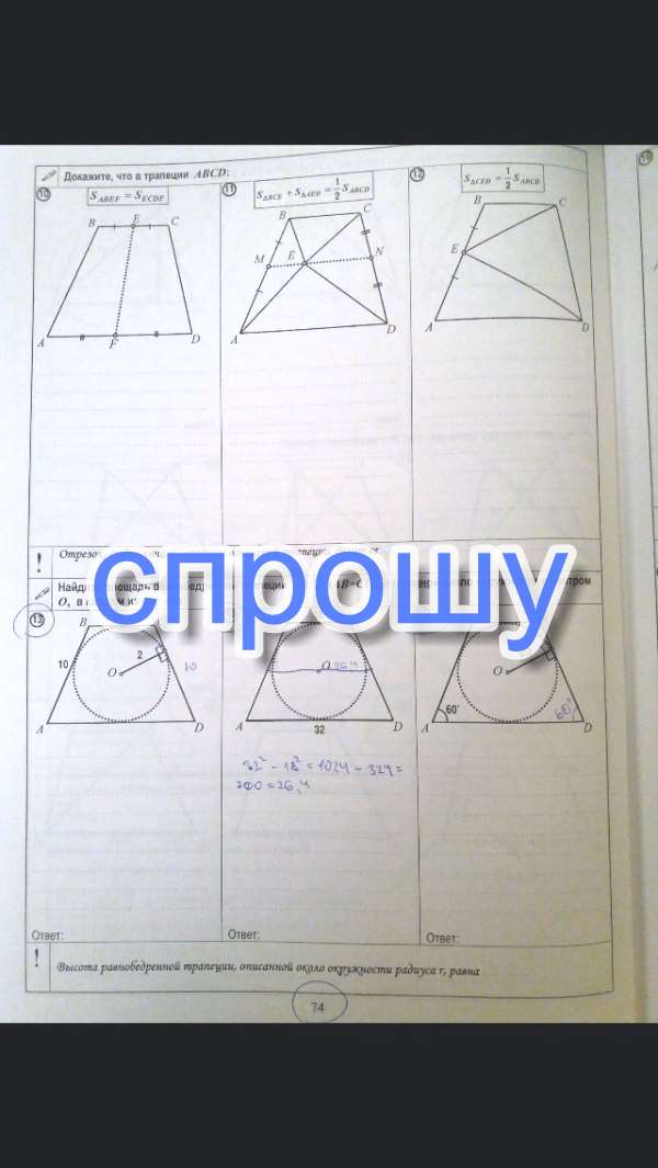 Найдите площадь равнобедренной трапеции ABCD(AB = CD)описанной около окружности с центром в точке О (13,14,15 задачи)