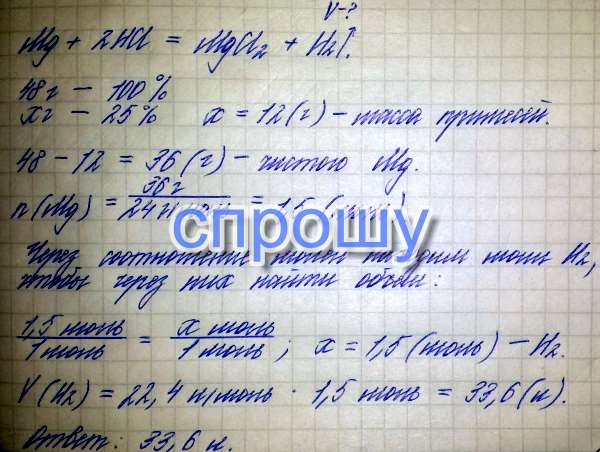 Какой объем водорода может быть получен при взаимодействии 48 граммов магния с соляной кислотой, если металл содержал 25% примесей ?