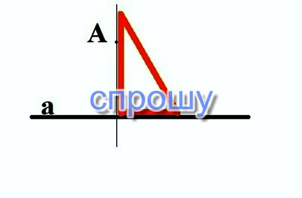 Чертежный треугольник имеет прямой угол. Необходимо совместить одной из сторон из прямого угла треугольника к прямой а и двигая вдоль прямой влево или вправо найти пересечение со второй стороной треугольника идущей из прямого угла с точкой А и провести прямую по этой стороне треугольника