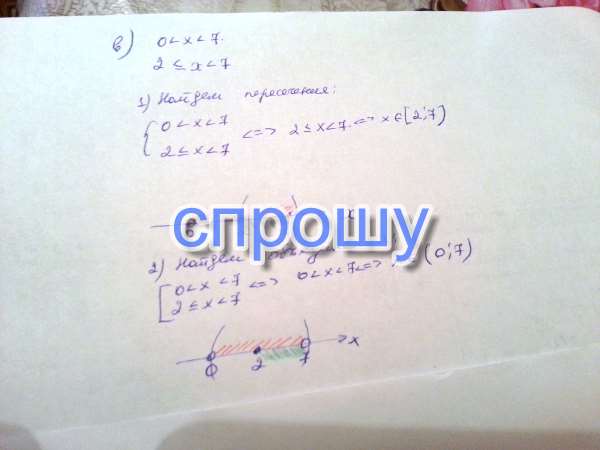 Изобразите на координатной прямой указанные промежутки (используйте для этого разные цветные карандаши). Найдите объединение и пересечение этих промежутков в) 0 < х < 7, 2 ≤ х < 7; г) -8 ≤ х < -4, -4 < х ≤ 0.