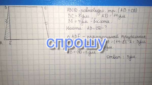 Тенбуйирли трапециянын табандары 8 дм жане 14 дм,ал бииктиги 4дм.Трапециянын буйир кабыргаларын тап
