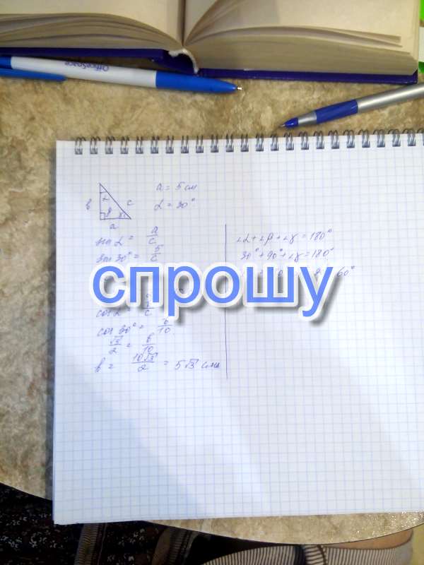 Даны катет а и противолежащий острый угол а прямоугольного треугольника. Найдите другие стороны и углы этого треугольника. 1) а = 5см, а = 30градусов