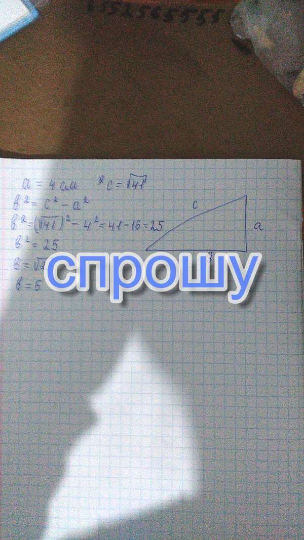 Можно просто ответ! В прямоугольном треугольнике a, b – катеты, c – гипотенуза. Найдите b, если a = 4 см, с √41 см.