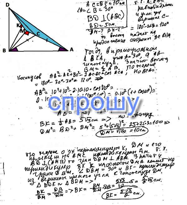 В треугольнике ABC стороны AC = BC = 20 см, угол A = 30°. Длина отрезка BF перпендикулярная плоскости треугольника 10 см. Надите расстояние от точки F до прямой AC и от точки B до плоскости AFC.