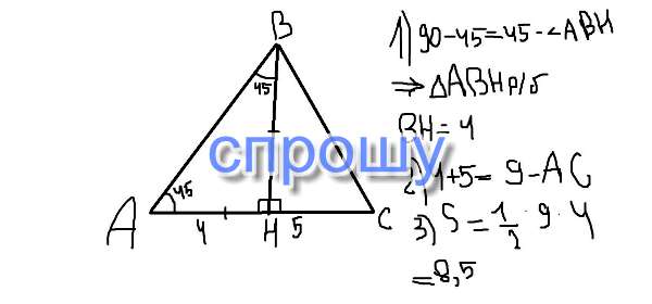 РЕБЯТ СРОЧНО ПОМОГИТЕ 34 баллов!!! Угол A треугольника ABC равен 45 градусам. Высота треугольника, проведенная из вершины B, делит сторону AC на отрезки 4см и 5см. Чему равна площадь тругольника?