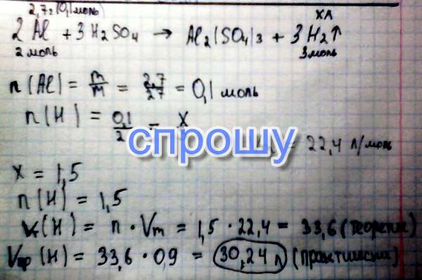 Какой объём водорода может быть получен при растворении 2,7г алюминия в серной кислоте если выход водорода состовляет 90% от теоритически возможного