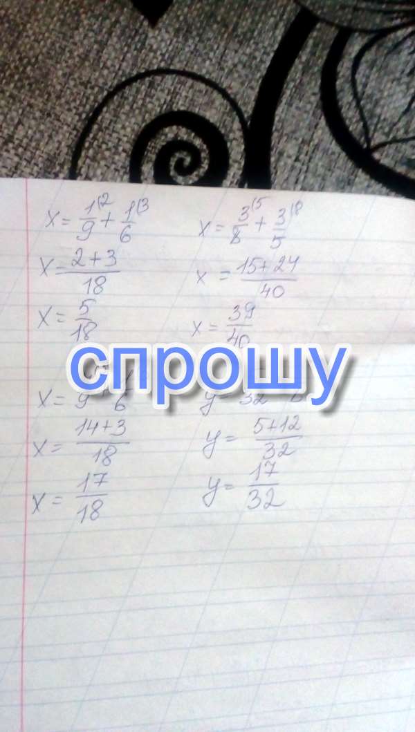 Решите уравнение: x-1/6 = 1/9; x-3/5 = 3/8; x-1/6 = 7/9; y-3/8 = 5/32;