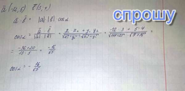 Вычислите косинус угла между векторами а и б,если а(-12;5),b(3;4)?