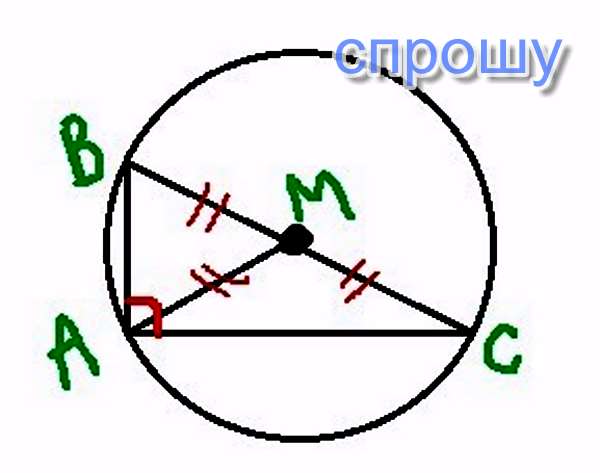 Представим, что точка М - центр окружности, а следовательно отрезки BM, MC и AM равны между собой по условию и равны радиусу данной окружности: