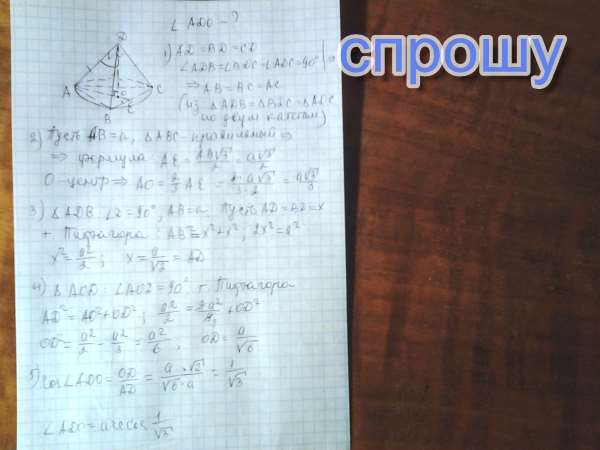 В конус вписана треугольная пирамида, боковые ребра которой попарно перпендикулярны. Найдите угол между образующей конуса и его высотой