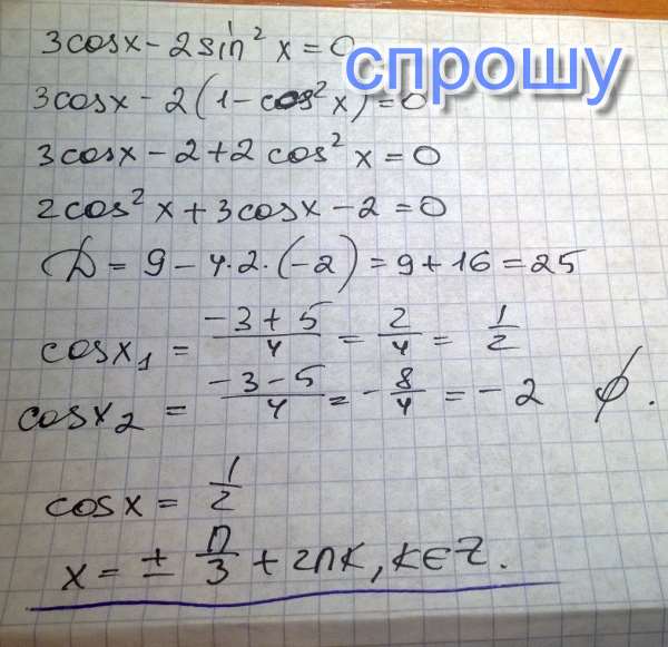 Решите уравнения правильно б) 3cosx-2sin²x = 0.