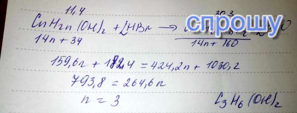 При взаимодействии 11,4 г двухатомного предельного спирта с бромводородом получено дигалогенпроизводное массой 30,3 г.Какой спирт был взят для этой реакции?