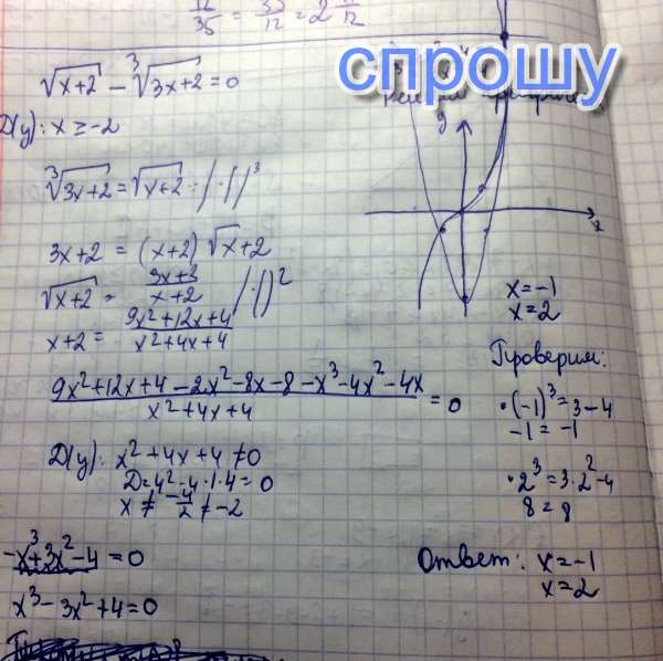Решить уравнения (x+2)^1/2 -(3x+2)^1/3 = 0