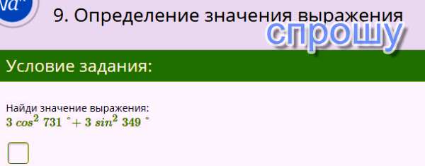 9) 3cos^2 731 +3sin^2 349=3(cos^2 (360*2+11) +sin^2 (360-11))=