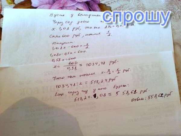 Вкладчик положил в банк некоторую сумму денег из расчёта 8% годовых. Через год он снял со своего вклада 600 рублей, в результате чего на его счёте осталась сумма, равная половине первоначального вклада. Какая сумма денег будет на счету у вкладчика в конце второго года хранения?