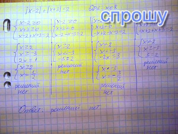 Реши уравнение |x−2|+|x+3| = 2